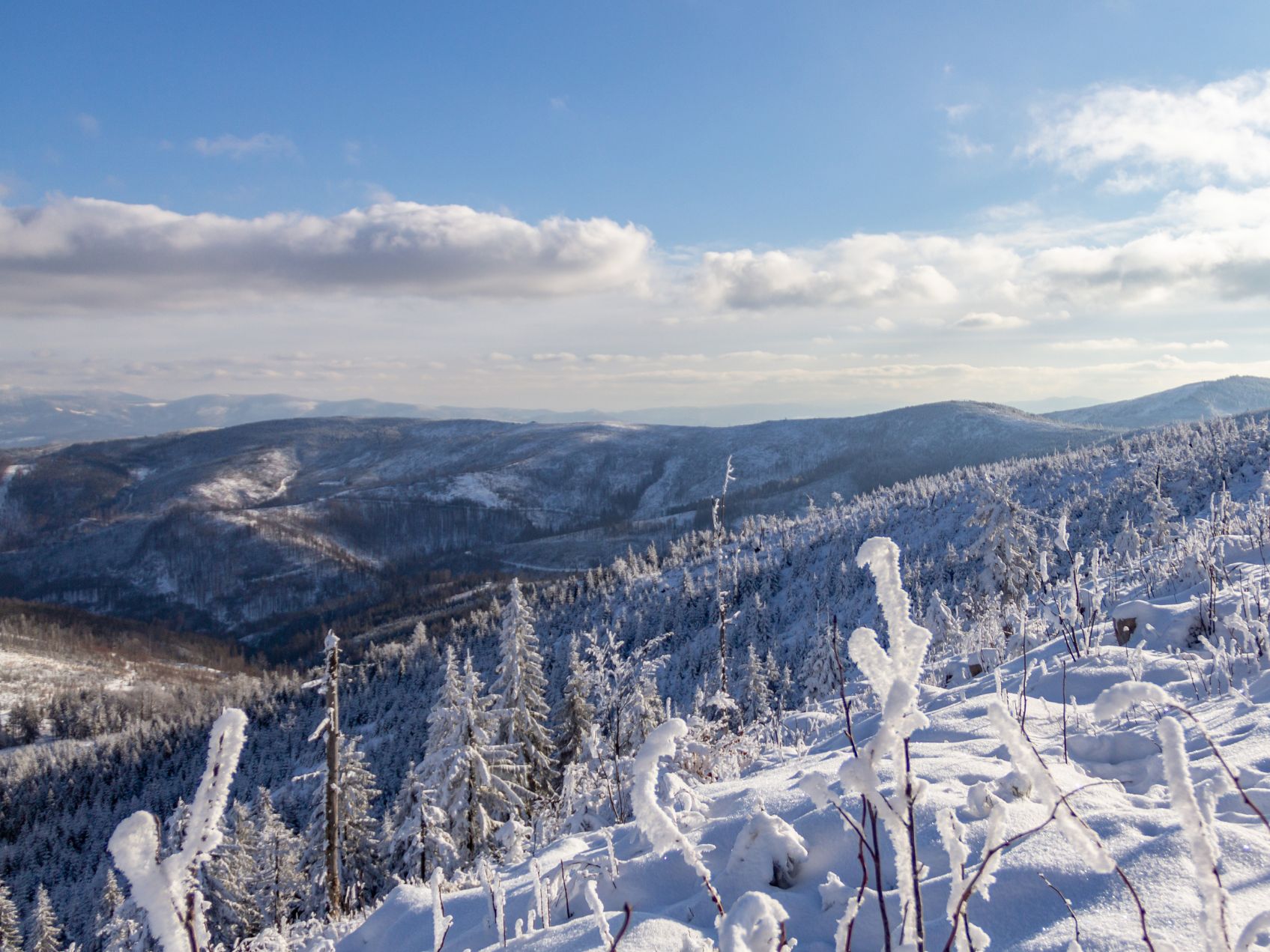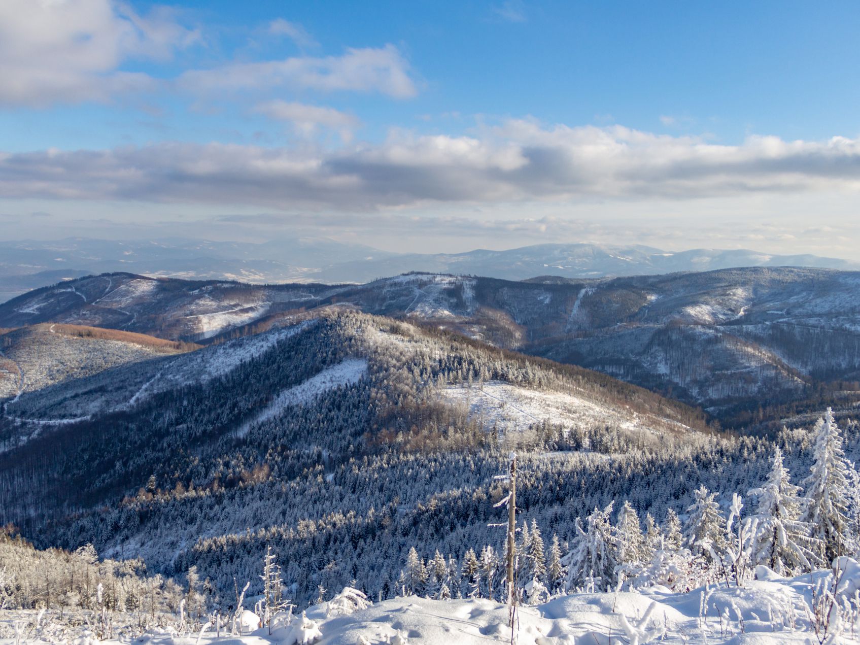 Szczyrk zimą – ośnieżone drzewa i panorama Skrzycznego