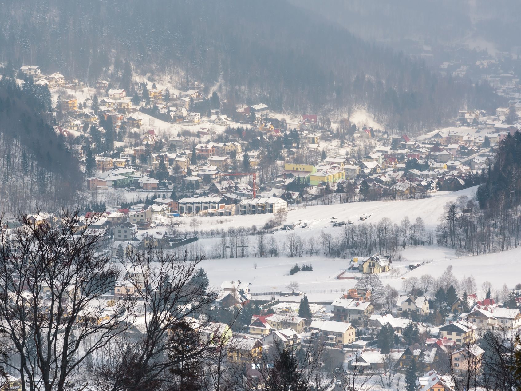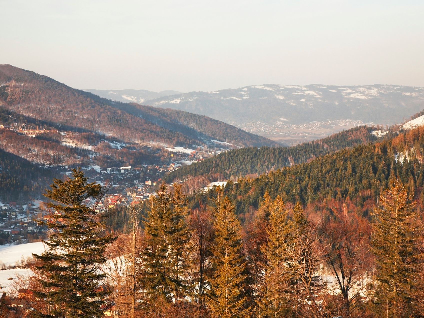 Zimowa panorama miasta – ośnieżone dachy Szczyrku